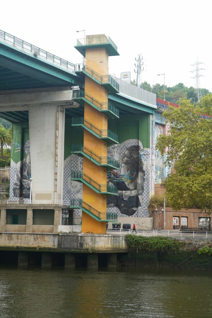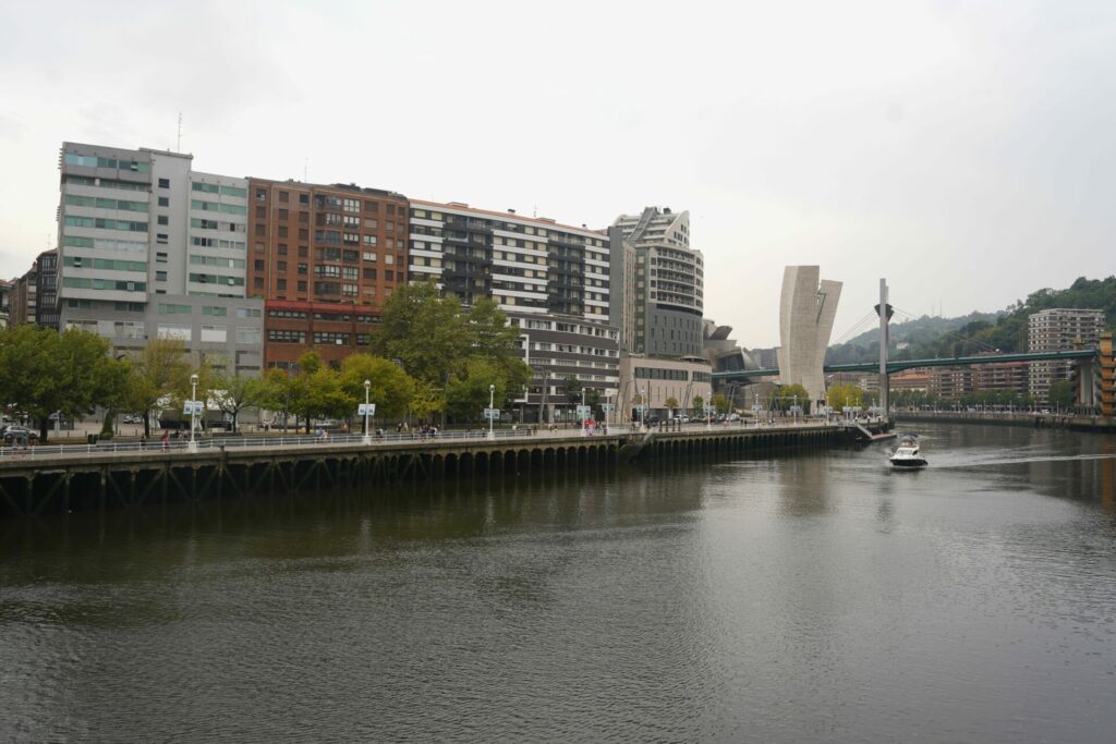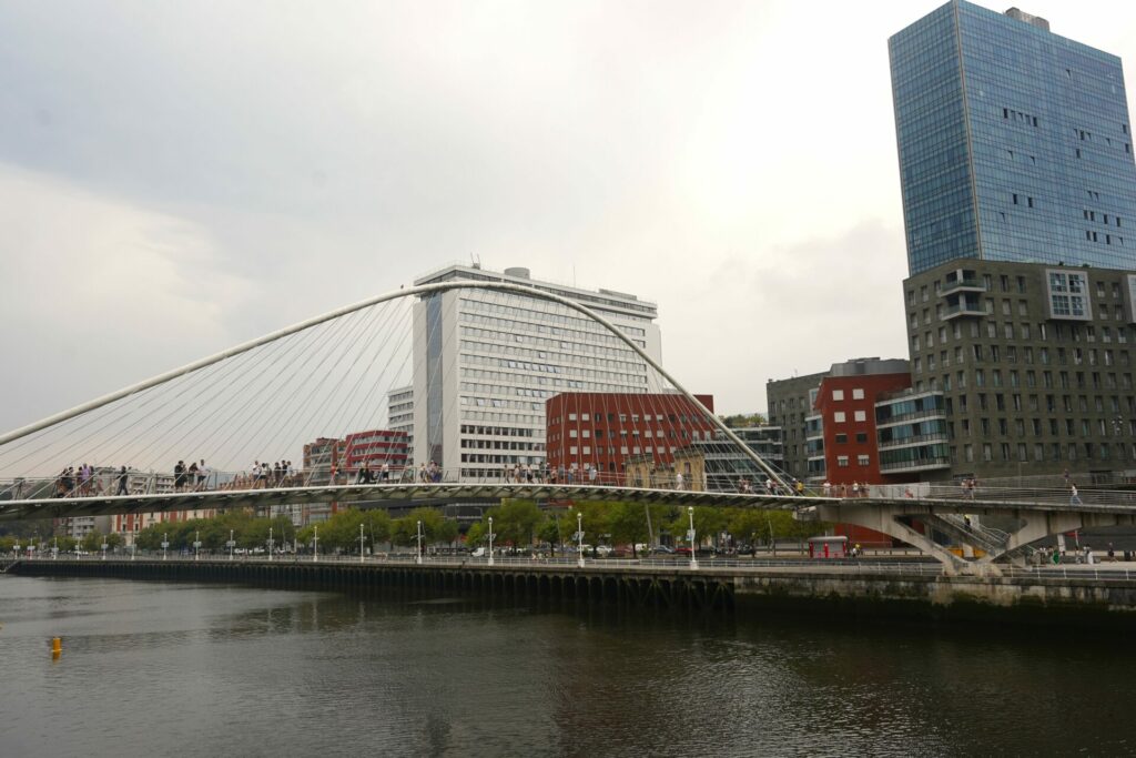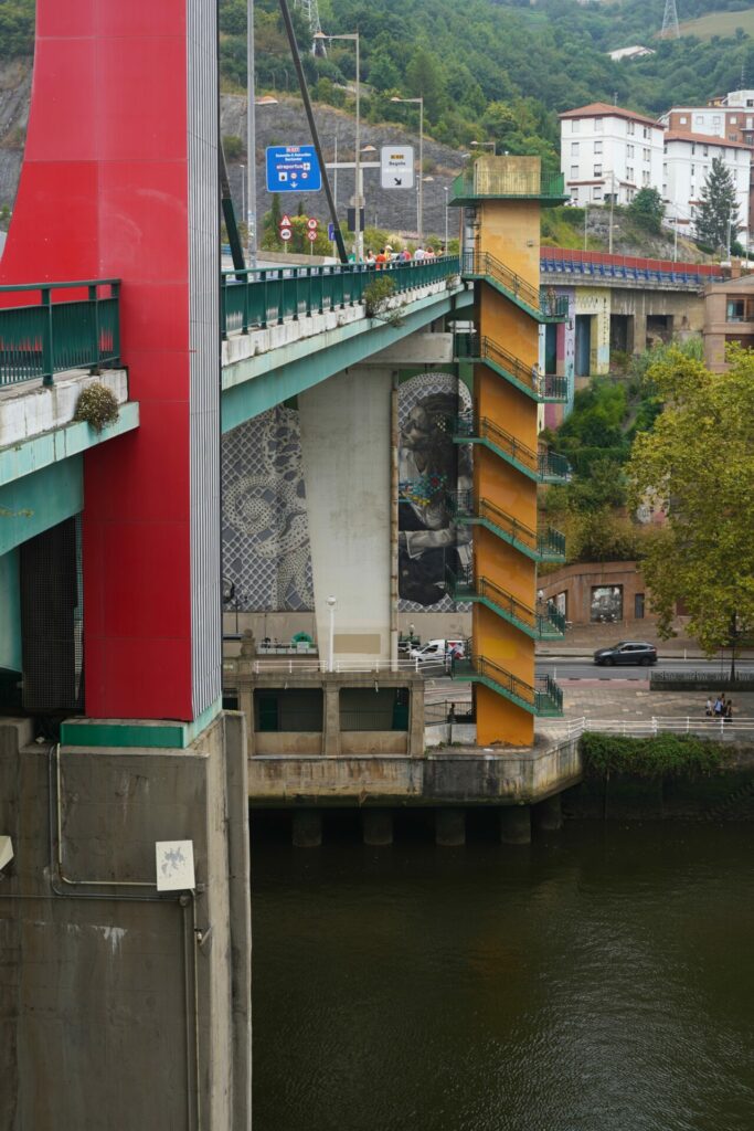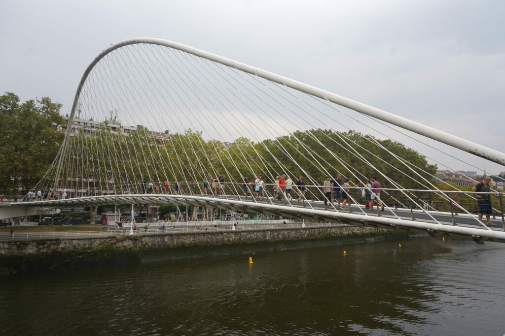 Nous montons sur le Puente de la Salve. Ce pont en béton vert fut le premier pont à haubans d’Espagne et l’un des rares à posséder un tablier métallique. Il fut construit au début des années 1970 pour relier le cœur de la ville aux quartiers environnants. Pour célébrer le dixième anniversaire du musée, une grande porte rouge, « L’Arc rouge », réalisée par l’artiste français Daniel Buren, a été inaugurée sur le pont.