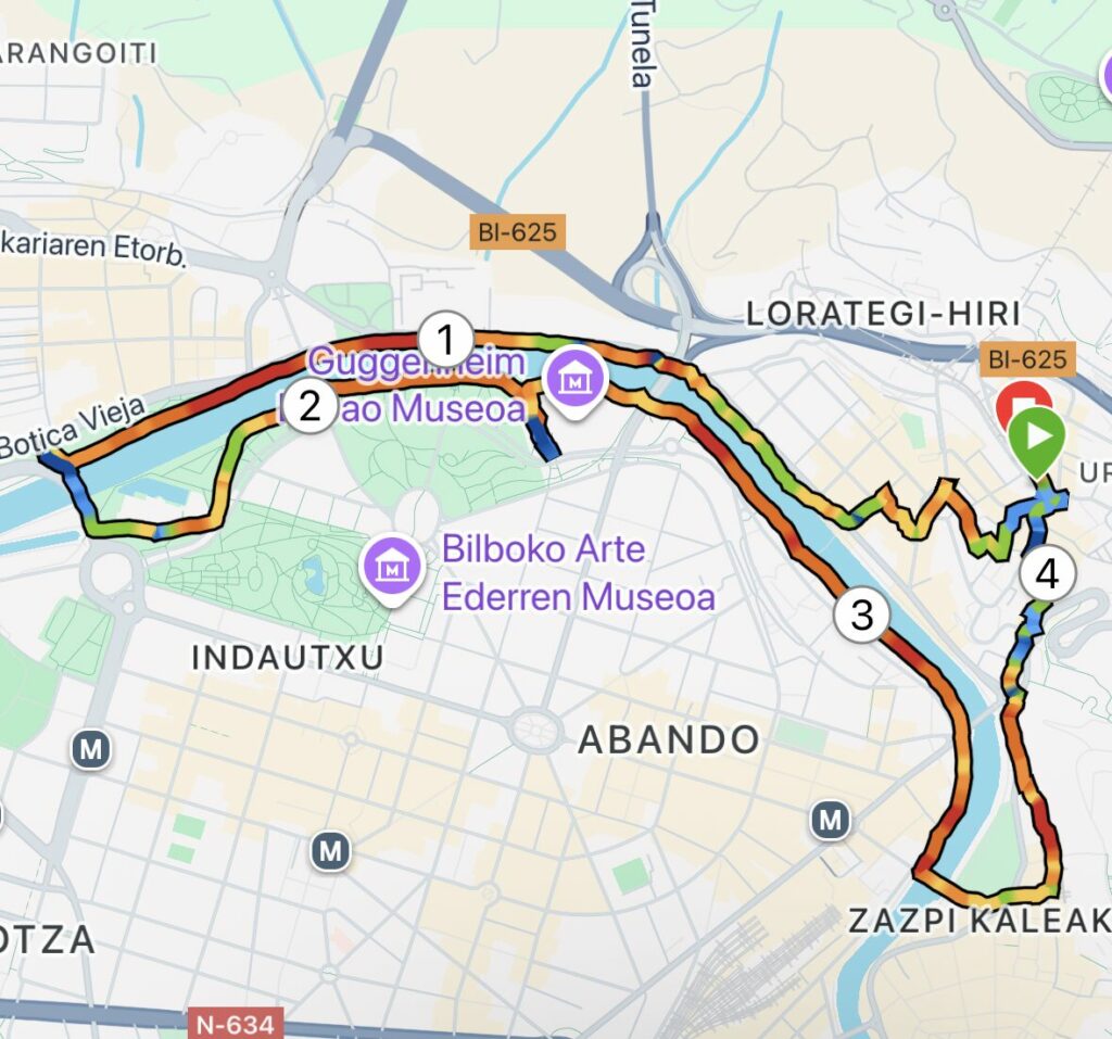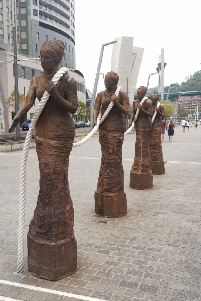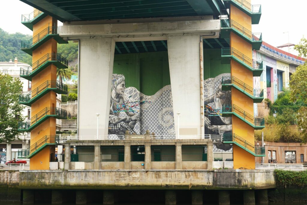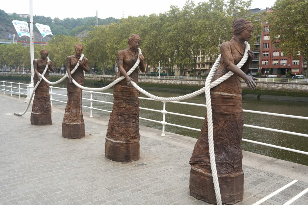 Nous montons sur le Puente de la Salve. Ce pont en béton vert fut le premier pont à haubans d’Espagne et l’un des rares à posséder un tablier métallique. Il fut construit au début des années 1970 pour relier le cœur de la ville aux quartiers environnants. Pour célébrer le dixième anniversaire du musée, une grande porte rouge, « L’Arc rouge », réalisée par l’artiste français Daniel Buren, a été inaugurée sur le pont.