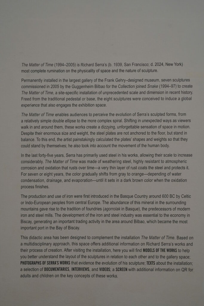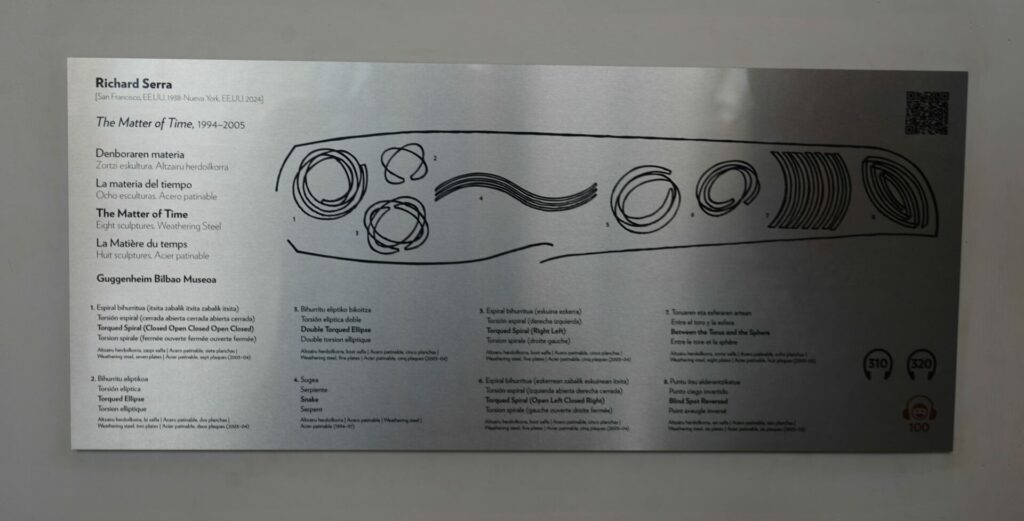 Le rez-de-chaussée du musée est dédié à une collection permanente que l’on doit à l’artiste contemporain américain Richard Serra : The Matter of Time (1994-2005) : ce gigantesque labyrinthe fait de panneaux d’acier attaqué par la rouille tient autant de l’art que de l’aire de jeux pour enfants.