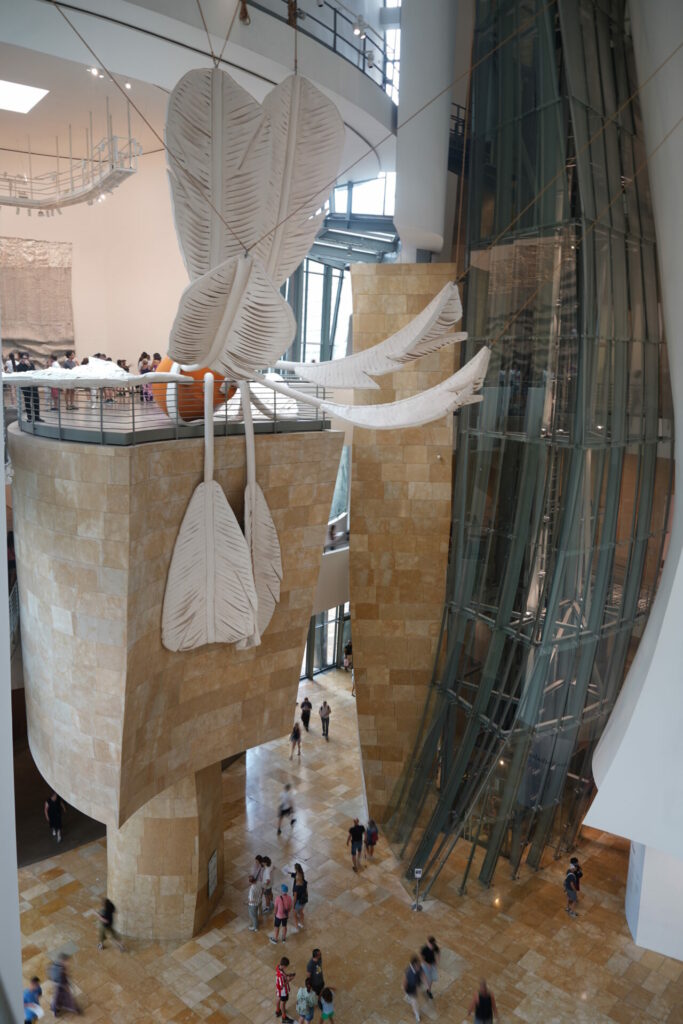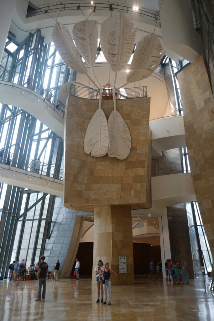 C’est par l’atrium, grand hall aux airs de cathédrale, que nous pénétrerons dans le Guggenheim. La lumière s’y déverse par d’immenses rideaux de verre et, à une extrémité, une verrière zénithale ouverte sur le ciel. L’atrium a été pensé pour ouvrir le musée sur les panoramas du fleuve et des collines alentour.